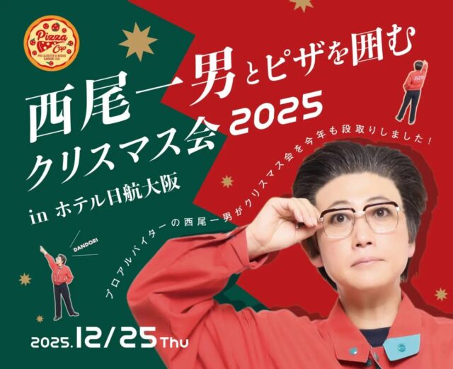 昨年大盛況を博した「西尾一男とピザを囲むクリスマス会」が、今年もホテル日航大阪で開催!宅配ピザ店「ピザキャップ」でお馴染みの中高年プロアルバイター・西尾一男が、華麗なピザさばきと軽妙なトークで贈る、唯一無二の“ピザ・エンターテイメント”。ホテル特製のピザやクリスマス料理を味わいながら、笑いと感動に包まれる特別な夜をお過ごしください。